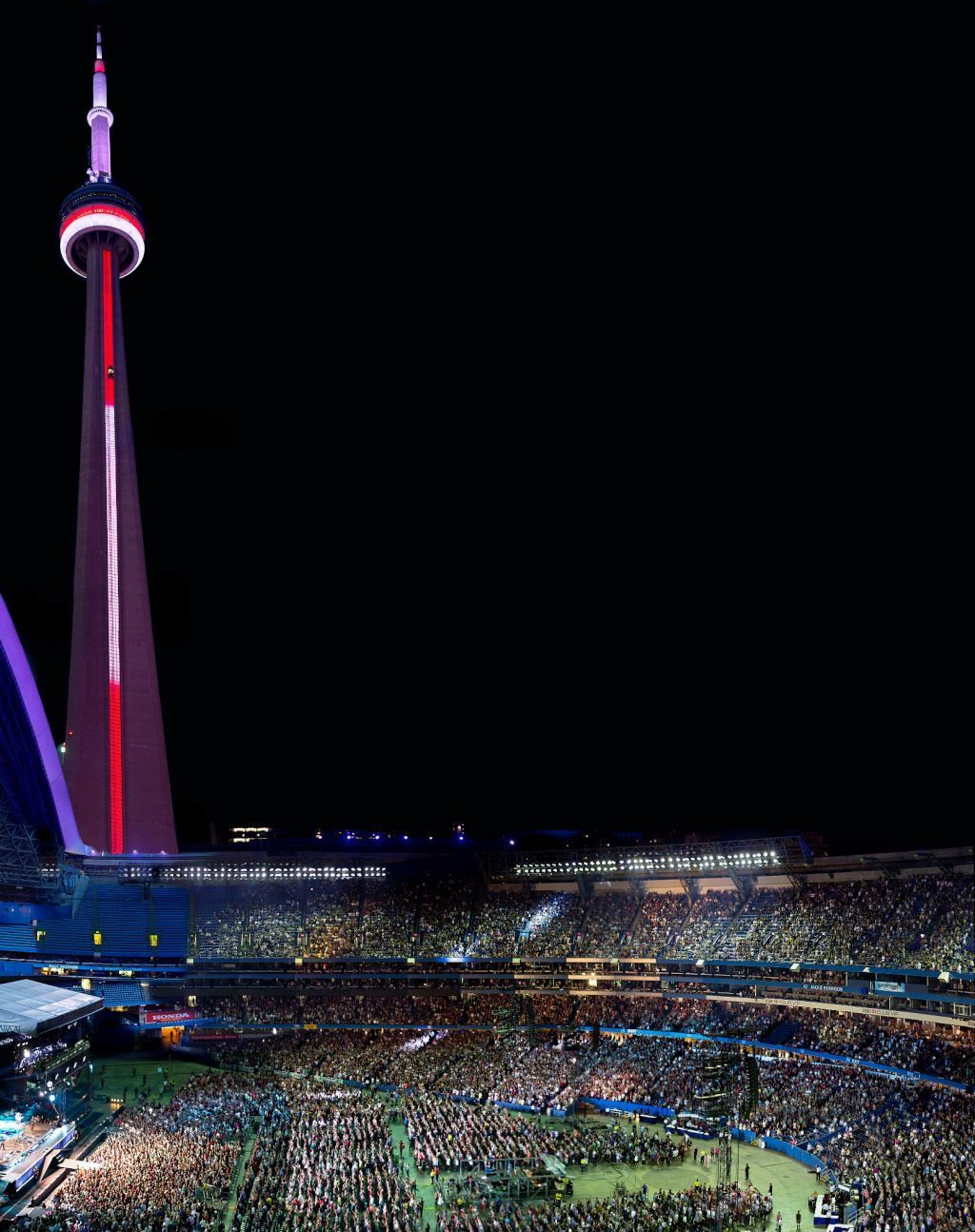 | Springsteen and the super-sized E Street Band continue impressive tour in Toronto When I first saw Bruce Springsteen and the E Street Band in Toronto, nearly 37 years ago on a cold night in 1975, I assured the guy sitting to my right he would enjoy the show. He most certainly did. We were sitting (at least nominally) 4 rows from the front. It started with 'Thunder Road' and a massive standing-on-the-chairs ovation. The last time I saw Bruce and his band, Friday night in Toronto, was in the huge Rogers Centre stadium (originally known as SkyDome) that my friend from 1975 had built (actually he was in charge of the 2600-person workforce that built it). I hope he was there Friday. I know Brian would have enjoyed the show again. And heard some of the same songs, including: 'Thunder Road', 'Tenth Avenue Freeze-Out', 'Spirit in the Night', 'She's the One' (with the killer and rare 'Mona' intro last heard here in 1978), 'Born to Run' and the eye-rolling classic 'Rosalita (Come Out Tonight)' which made it clear why they had opened the roof (preservation). The superb sound was visually assisted by state-of-the-art video, especially the screen right behind the band (and just in front of the original Jumbotron, in 1990 the world's largest video screen). Every moment became personal from anywhere in the cavernous setting. But only a few artists can transcend such a space, and Springsteen made it as warm and inviting as back in 1975 in the borrowed gym then known as the Seneca College Fieldhouse for nearly 3,000 fans eager to see "the future of rock and roll". Well, the future is still now. Springsteen has always been a showman and he didn't disappoint. But neither did the fans. A highlight was the vocal work of a young lady from Michigan on 'Thundercrack' while a slightly older fan danced with Bruce after her husband held up a sign saying 'Dance with my wife on our anniversary'. He was given beer (which he chugged), signs full of symbolism (the killer version of 'Thundercrack'), requests for old and brand-new songs, and gave the band a rest with a solo piano version of 'Incident on 57th Street' that was to die for, as Spanish Johnny was willing to do. Imagine 60,000 or so people hanging on every acoustic piano strike and every breathless lyric, then singing along on cue. No loud drunken louts. A magic moment. Jake Clemons and Ed Manion on sax provided power on demand throughout the night, with the former never failing to live up to the legend and well-known notes his late uncle Clarence had made sacred. The rest of the horns also showed why their skills brought them here this night. Every musician in the world should some day be so fortunate to have horns like this. And the rest of the band and the mix of vocalists are note on every time. This tour is rumoured to run another 18 months. They would be welcomed back here with another sell-out. It certainly doesn't look anything like a farewell tour. This multi-continent run since March has taken on epic proportions and Toronto was no exception, offering a mix of old and new at the top of the scale and in a city-record show running 3:36 (yes, 3 hours and 36 minutes from a 62-year-old legend who can't even spell "resting on his laurels", but could probably write a killer song about it). | |